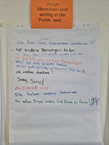 Zur inhaltlichen Einstimmung hatten die Jugendlichen die Aufgabe, verschiedene Sätze rund um das Thema Demokratie und Landtagswahl zu beenden. Mit Stiften bewaffnet machten sich die Jugendlichen auf die Suche nach den Plakaten. Damit konnte ein erstes Stimmungsbild und das Vorwissen abgefragt werden.